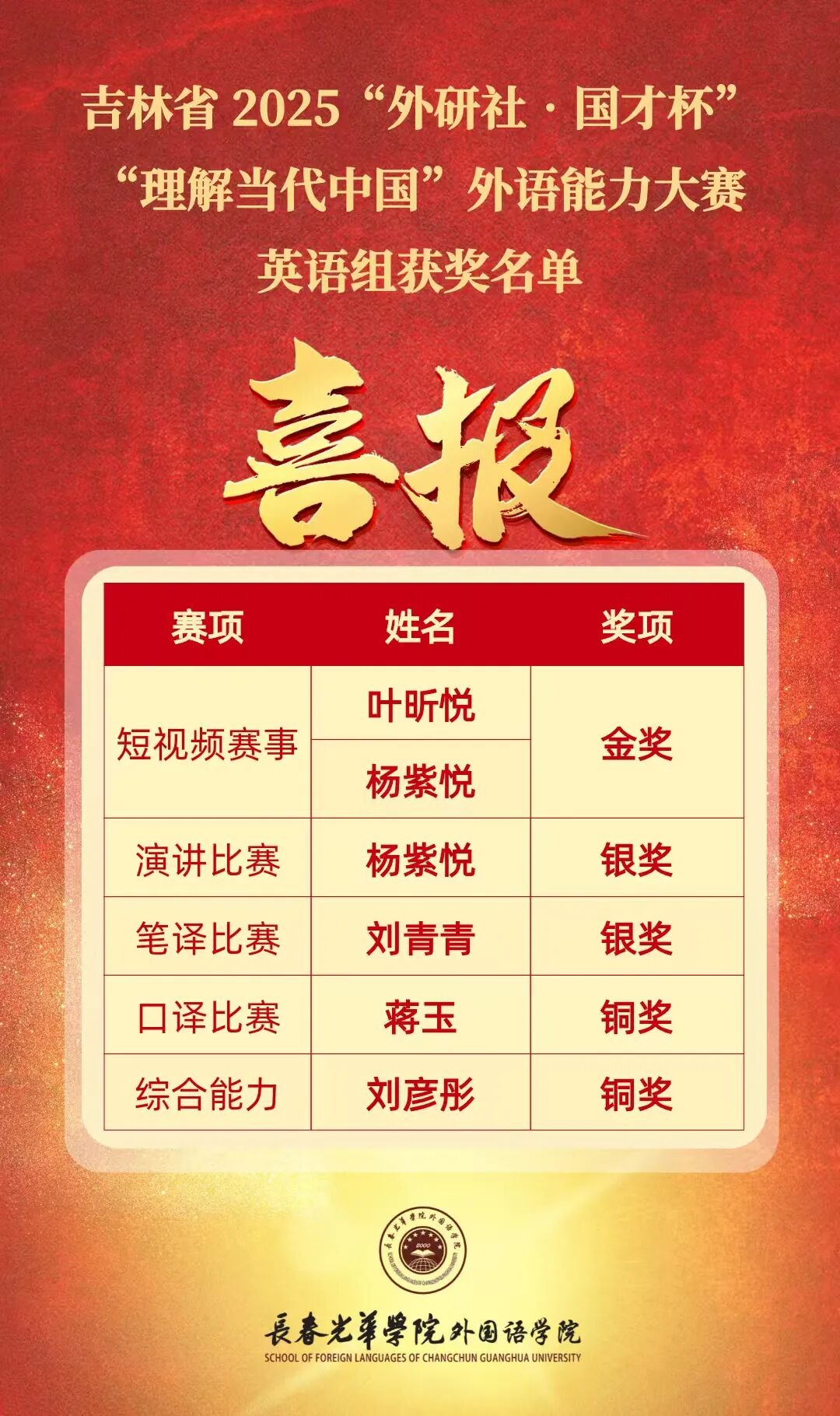近日,2025年“外研社·国才杯”“理解当代中国”全国大学生外语能力大赛吉林省比赛成绩公布,我校外国语学院英语专业学生在短视频、演讲、笔译、口译、综合能力等赛项中表现优异,共获金奖1项、银奖2项、铜奖2项,尤其在短视频赛道实现历史性突破,首次参赛即斩获省赛金奖并成功晋级国赛,彰显了我校英语专业教学改革与育人实效的全面提升。