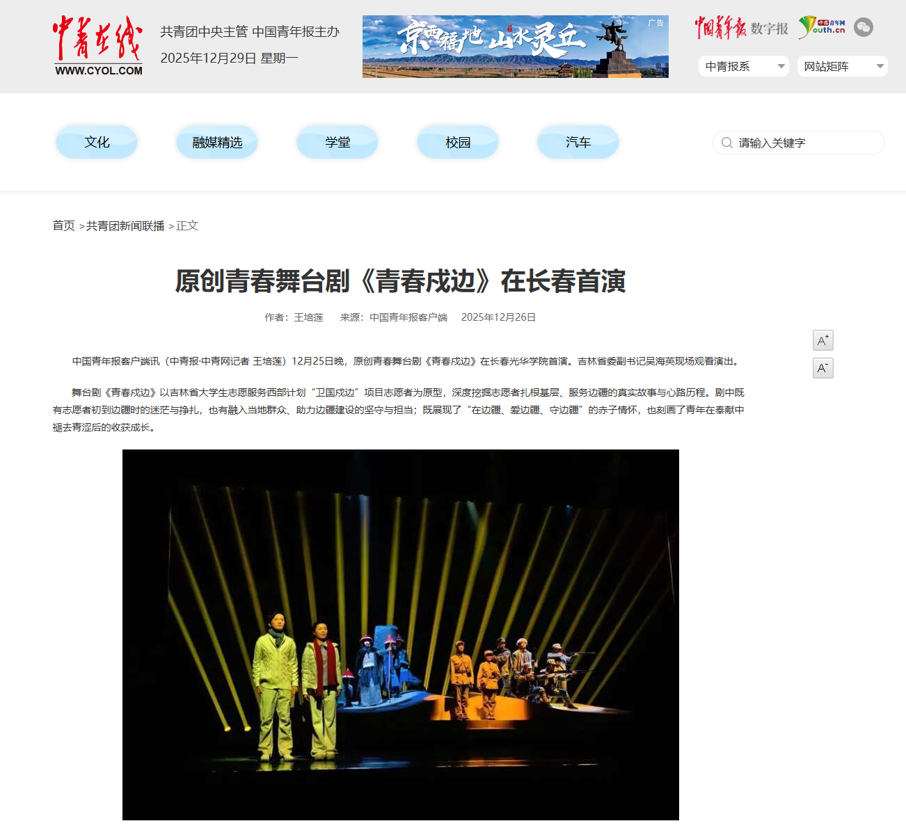 中国青年报|原创青春舞台剧《青春戍边》在长春首演