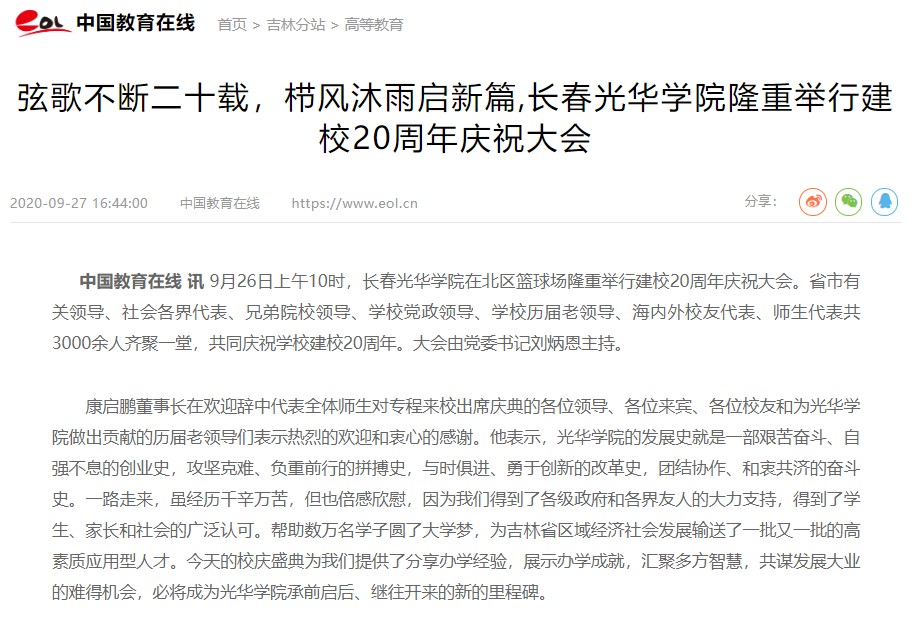 中国教育在线|弦歌不断二十载,栉风沐雨启新篇,长春光华学院隆重举行建校20周年庆祝大会